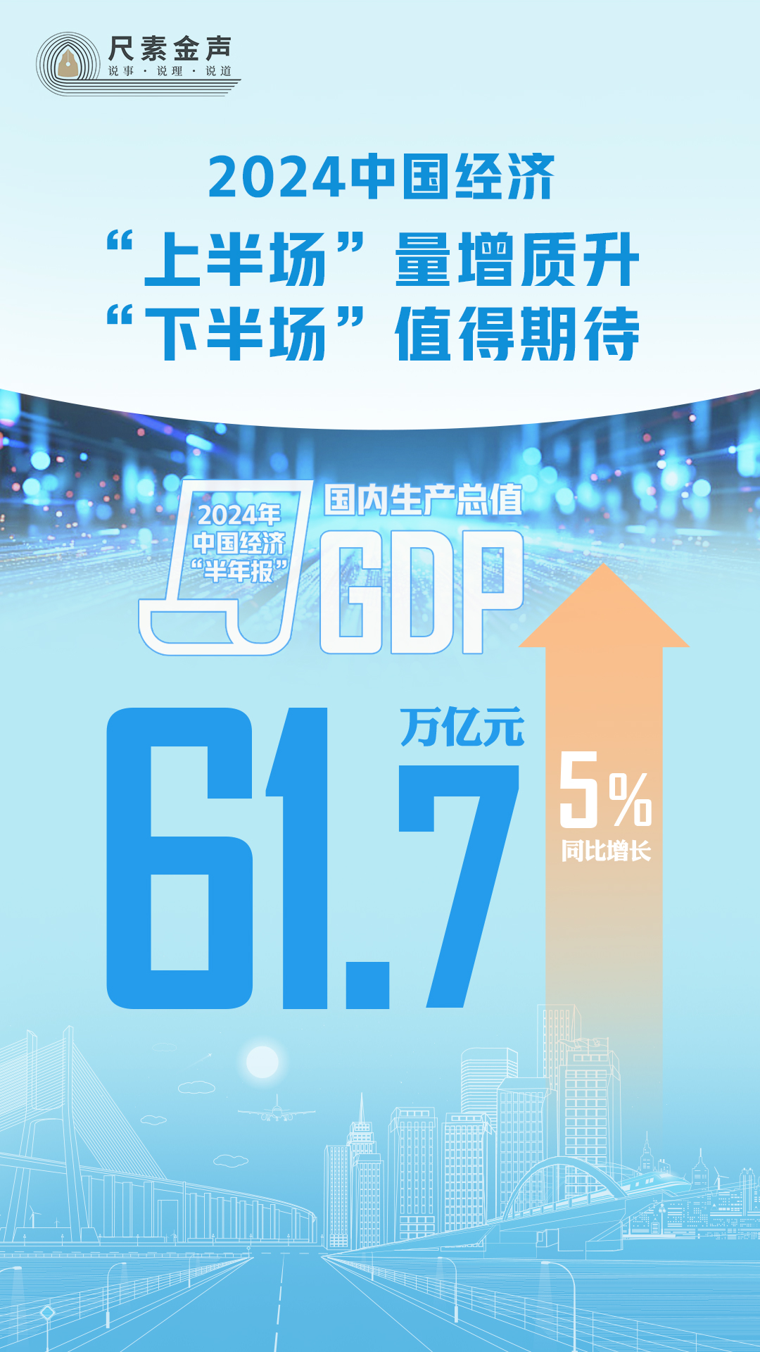 正在北京舉行的黨的二十屆三中全會,將重點研究進一步全面深化改革、推進中國式現(xiàn)代化。改革的“時代新篇”萬眾矚目,中國的發(fā)展也令人高度關注——同日,國家統(tǒng)計局發(fā)布2024年中國經(jīng)濟“半年報”:國內生產(chǎn)總值(GDP)61.7萬億元,同比增長5%。結合二季度國內外形勢,預計上半年中國經(jīng)濟增速仍將保持領先,仍是世界經(jīng)濟增長的重要引擎和穩(wěn)定力量。