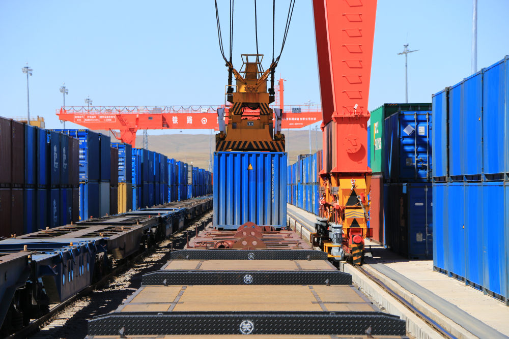 5月15日,中國鐵路哈爾濱局集團有限公司滿洲里站貨運車間集裝箱場在對中歐班列進行換裝作業(yè)。新華社發(fā)(黃旭攝)