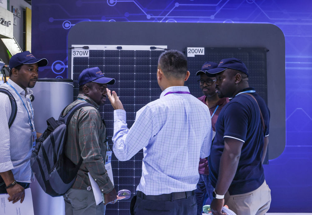 4月15日,參展商在第135屆廣交會上向采購商介紹太陽能電池組件展品。新華社記者 劉大偉 攝