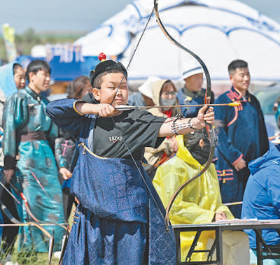搏克場上,勇士們身姿矯健,近身搏斗;射箭場上,選手們屏息凝神,箭羽破空而出;沙嘎比賽的蒙古包內(nèi),孩童們競相投擲,充滿樂趣……遠處,悠揚的馬頭琴聲伴著奶茶醇香,游客們歡聲笑語,沉浸在這場體育盛宴中。