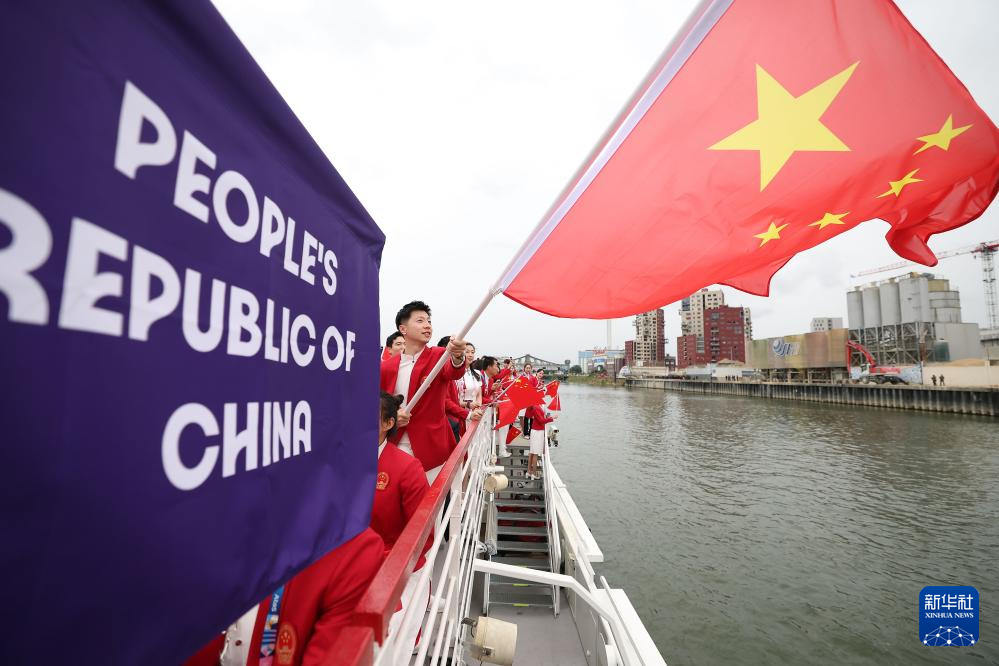 7月26日,中國體育代表團旗手、花樣游泳選手馮雨在開幕式上揮舞國旗。新華社記者 曹燦 攝