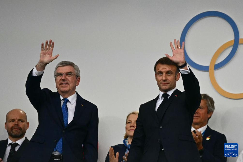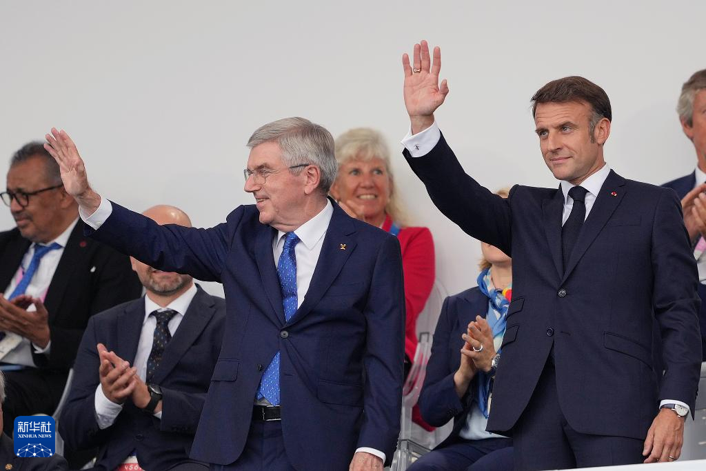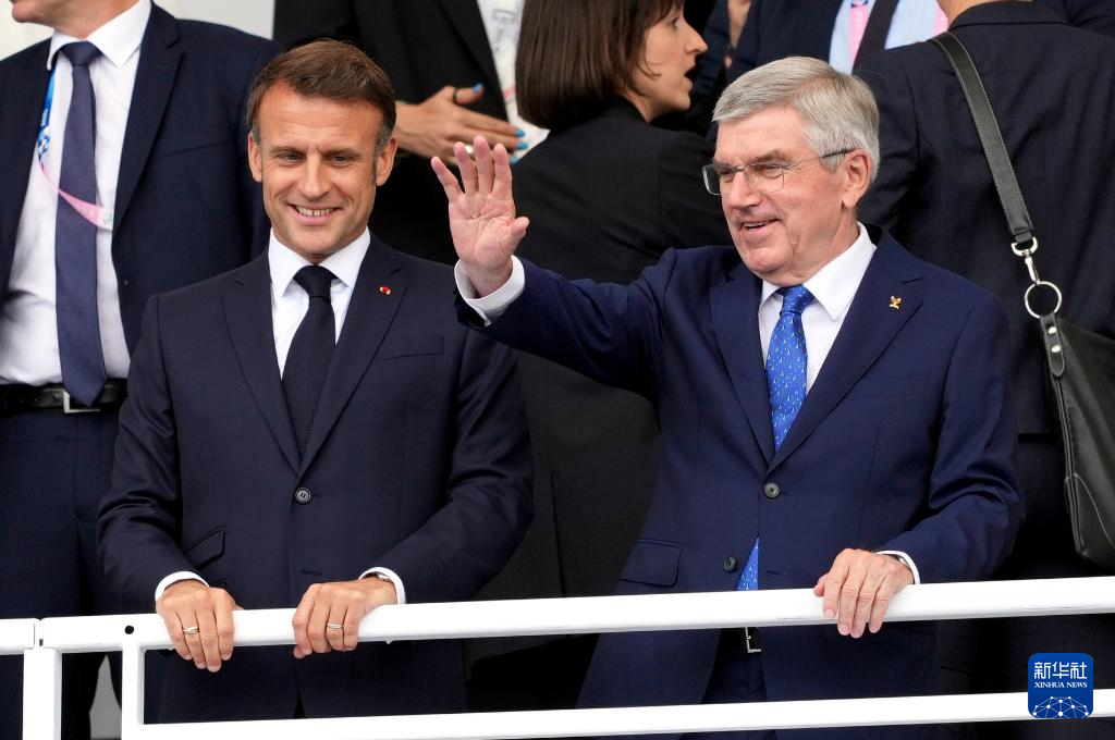7月26日,國際奧委會主席巴赫(前左)與法國總統(tǒng)馬克龍(前右)出席開幕式。新華社記者 王毓國 攝