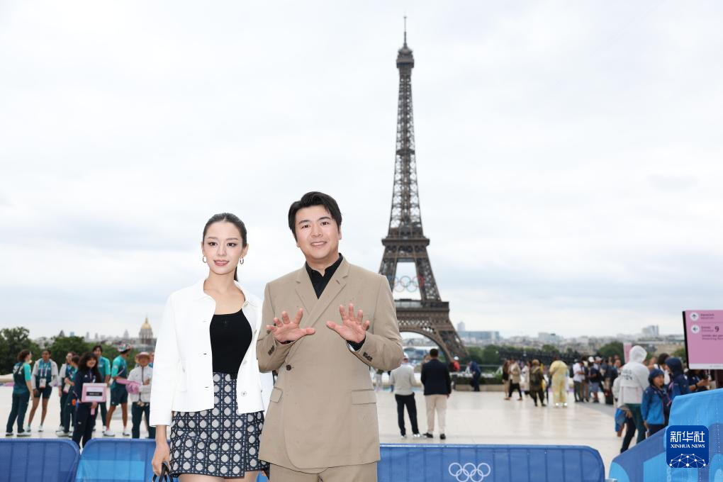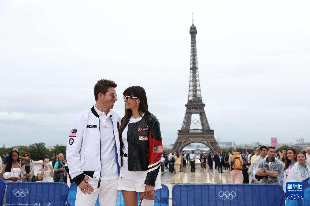 7月26日,中國體育代表團旗手、乒乓球選手馬龍(左)與哥倫比亞體育代表團成員在埃菲爾鐵塔前相互致意。新華社記者 李明 攝