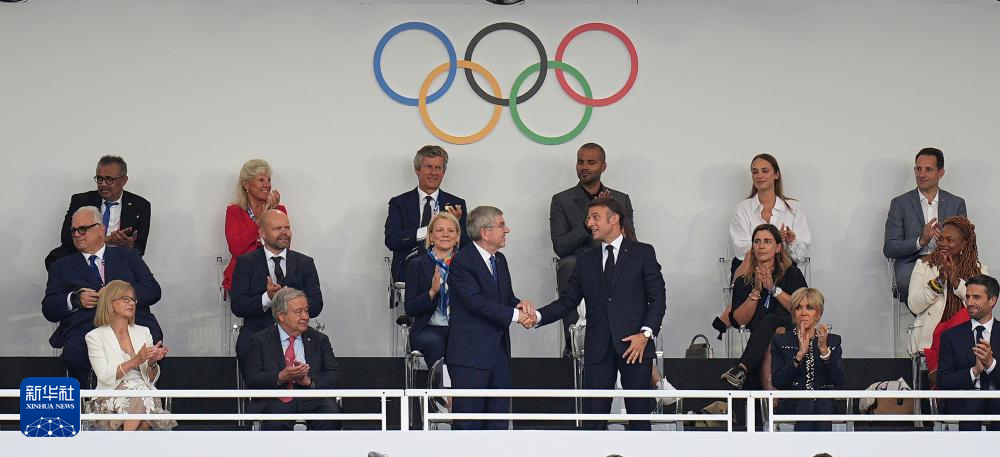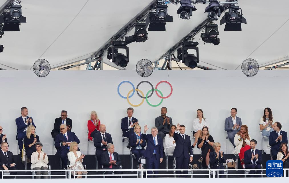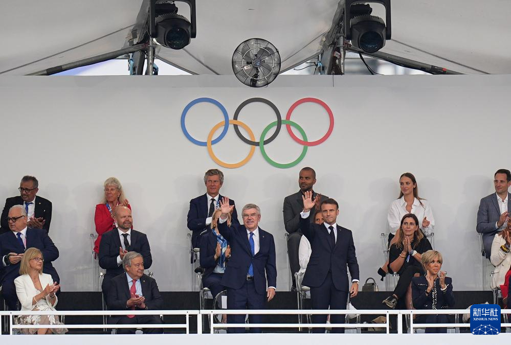 7月26日,國際奧委會主席巴赫(前排左三)和法國總統(tǒng)馬克龍(前排左四)出席開幕式。新華社記者 許暢 攝