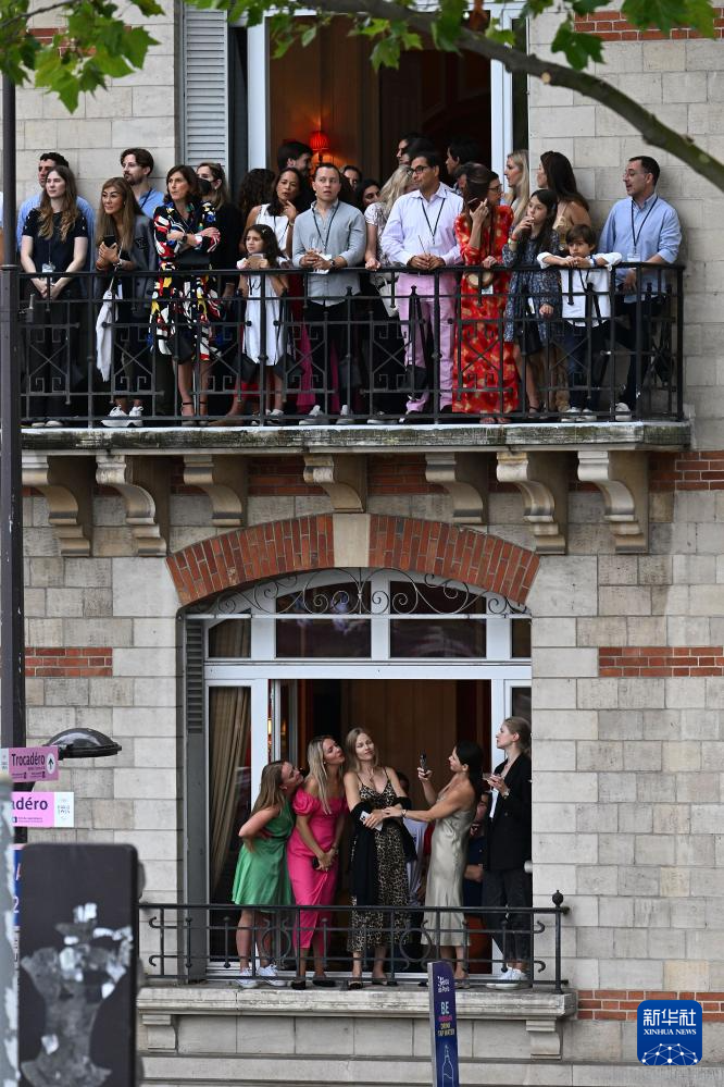 7月26日,中國體育代表團成員(前)抵達特羅卡德羅廣場開幕式慶祝儀式現場。新華社記者 高靜 攝