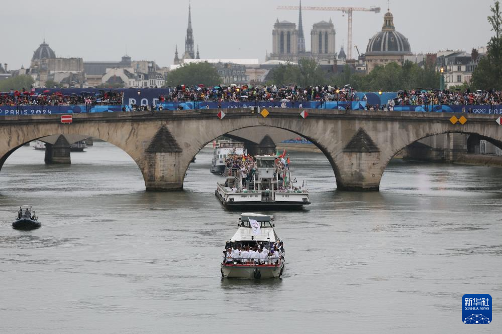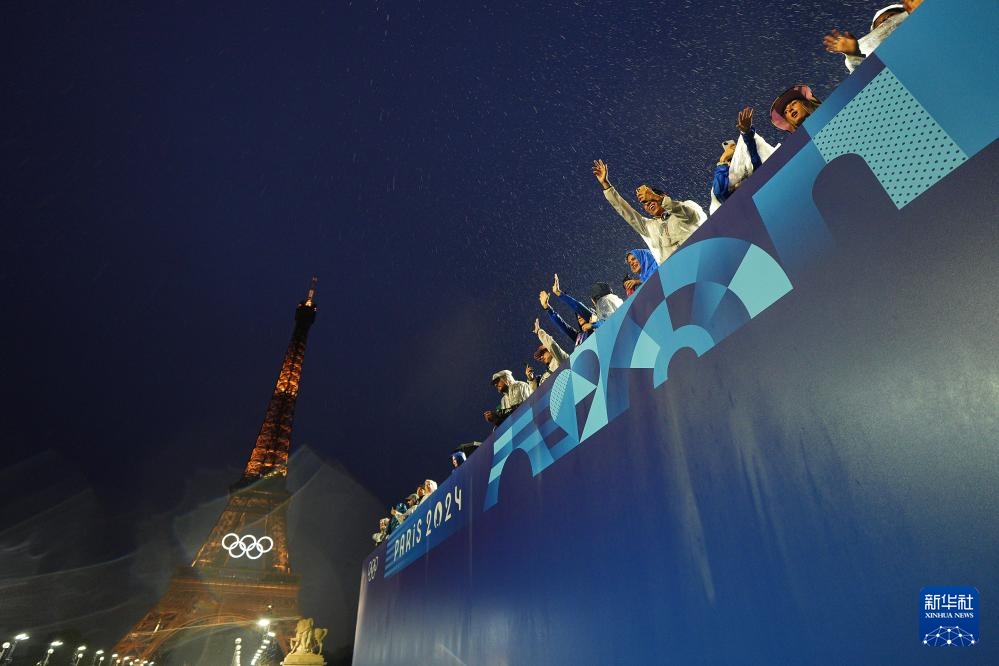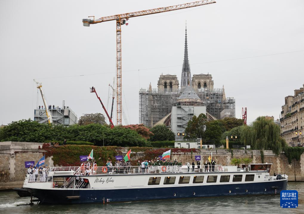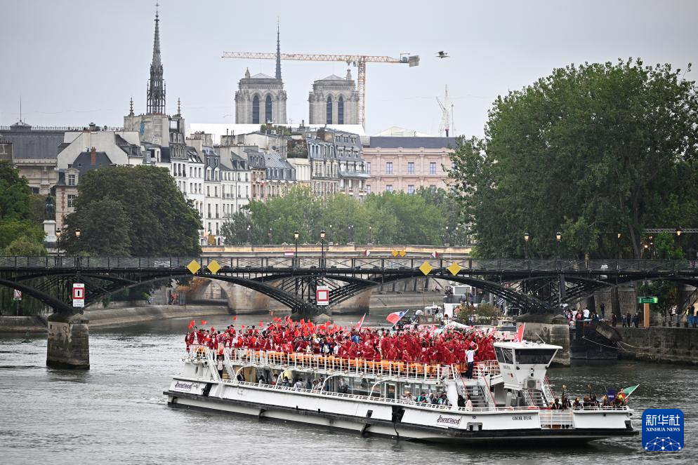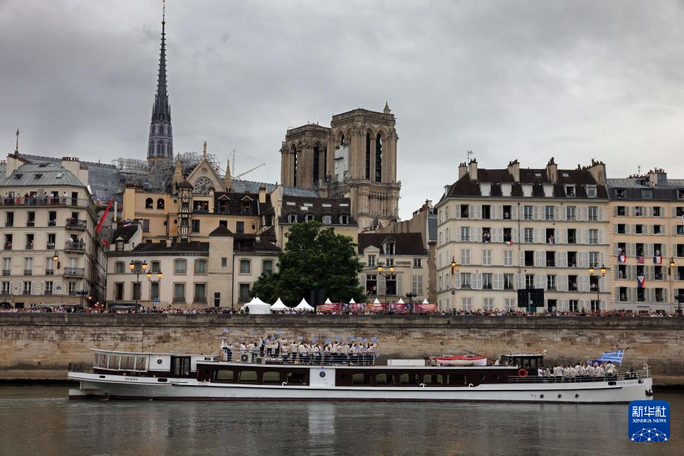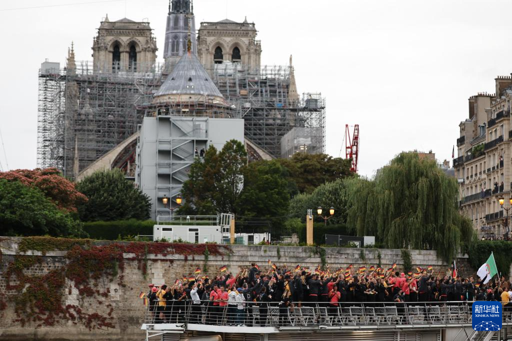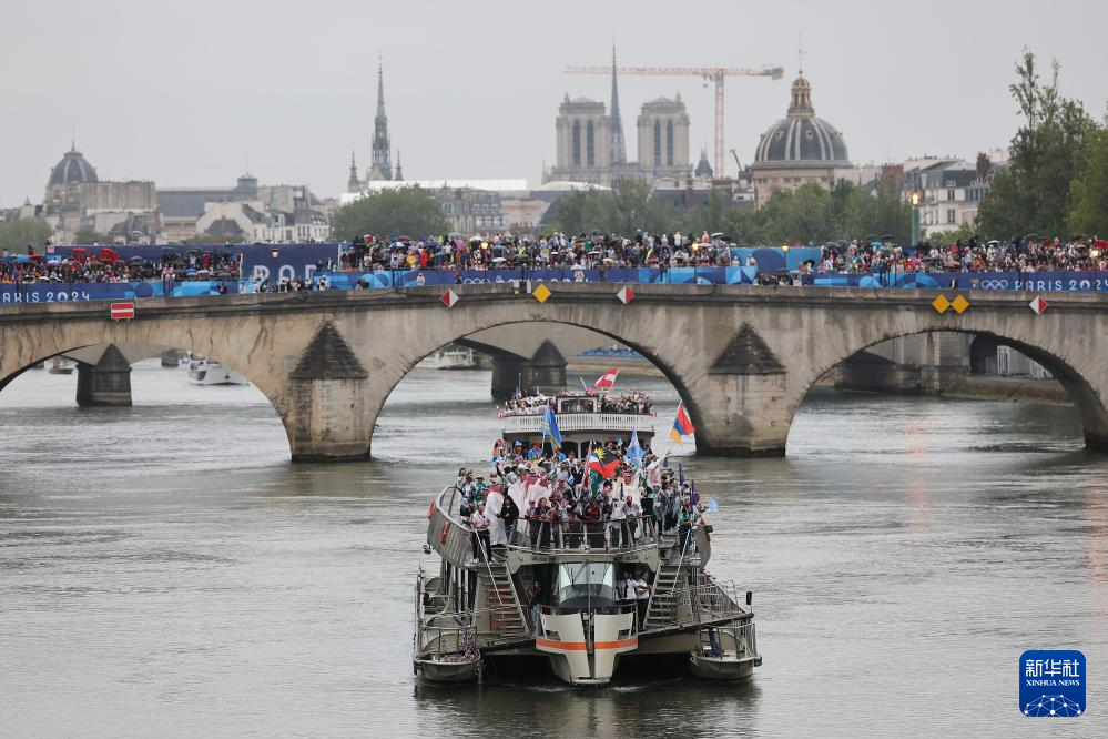 7月26日,各體育代表團在開幕式上,右側是巴黎圣母院。新華社發(fā)(POOL照片/丹·馬蘭)pagebreak
