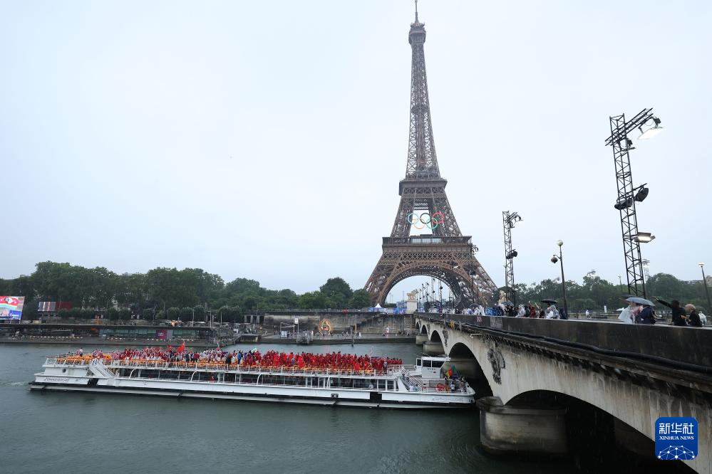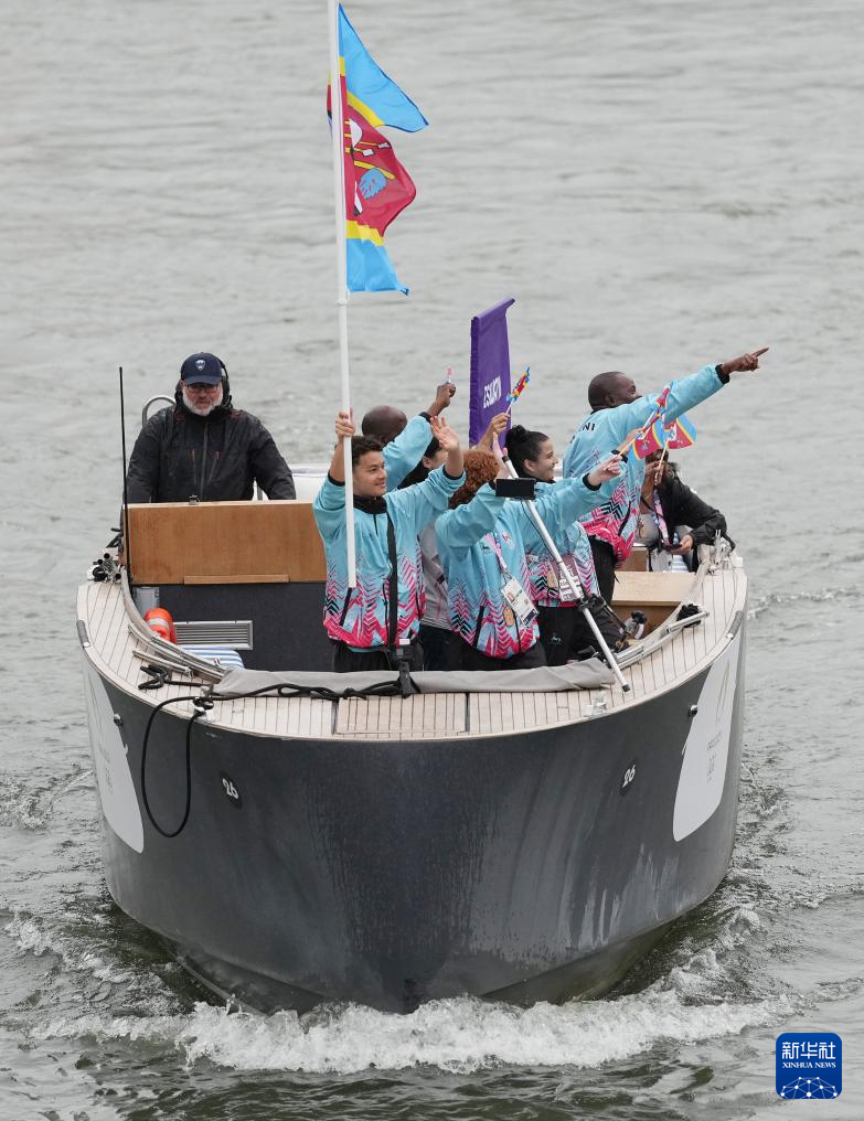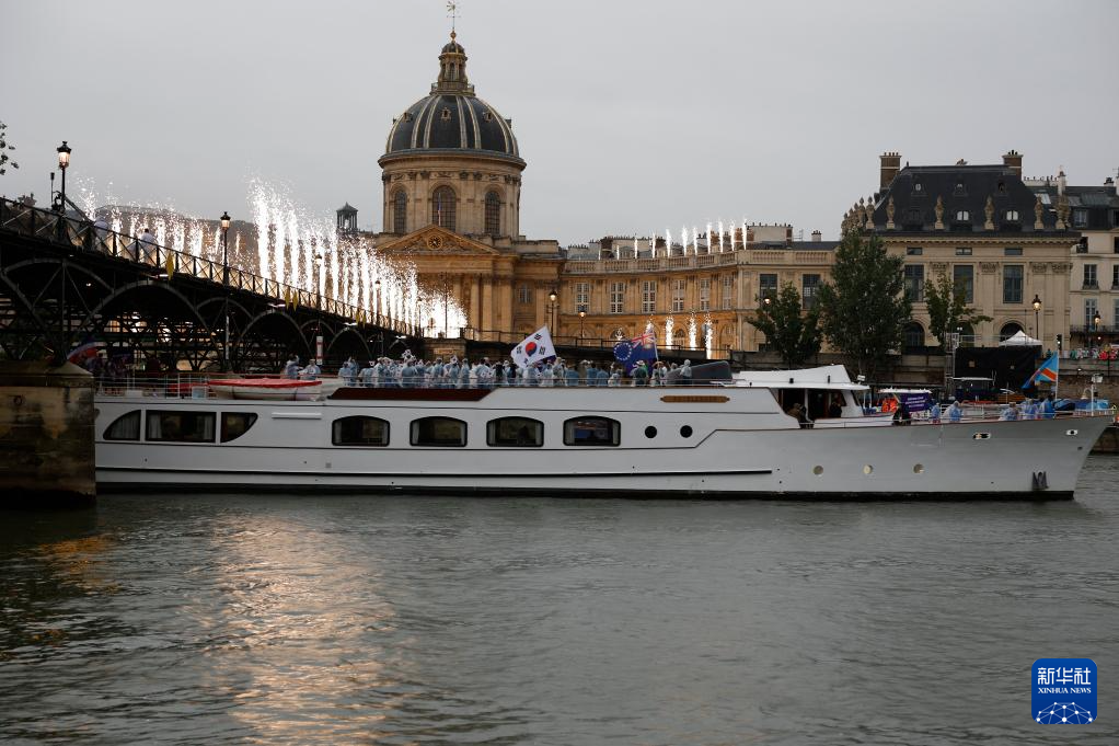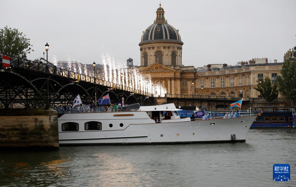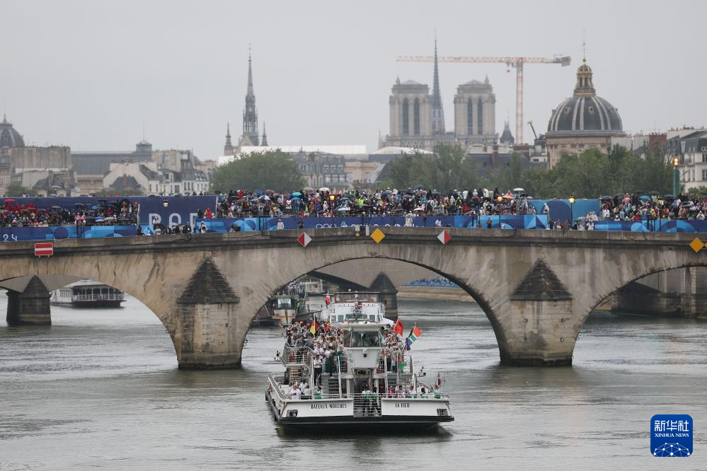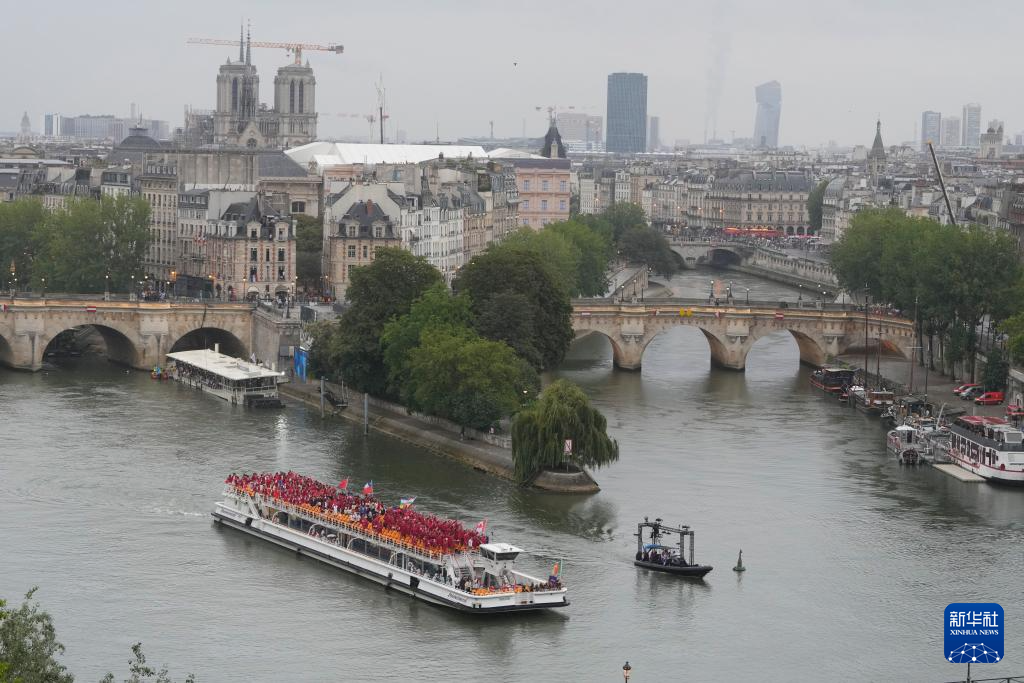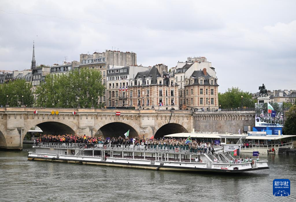 7月26日,各體育代表團在開幕式上,右側是巴黎圣母院。新華社發(fā)(POOL照片/丹·馬蘭)pagebreak