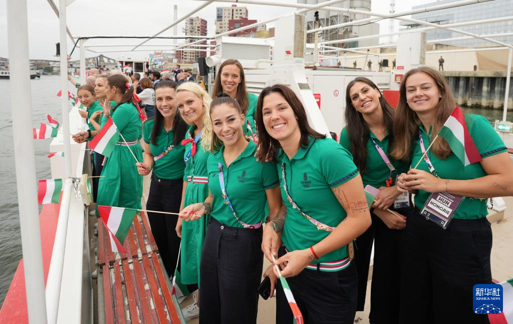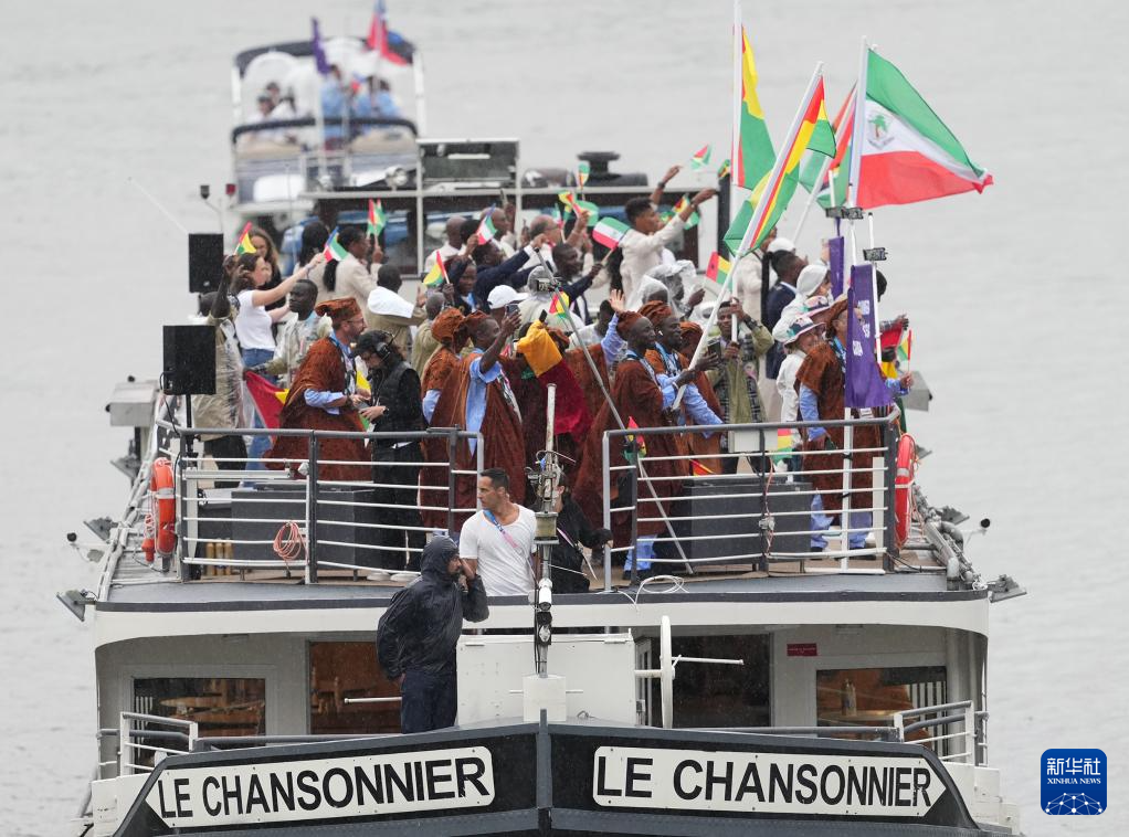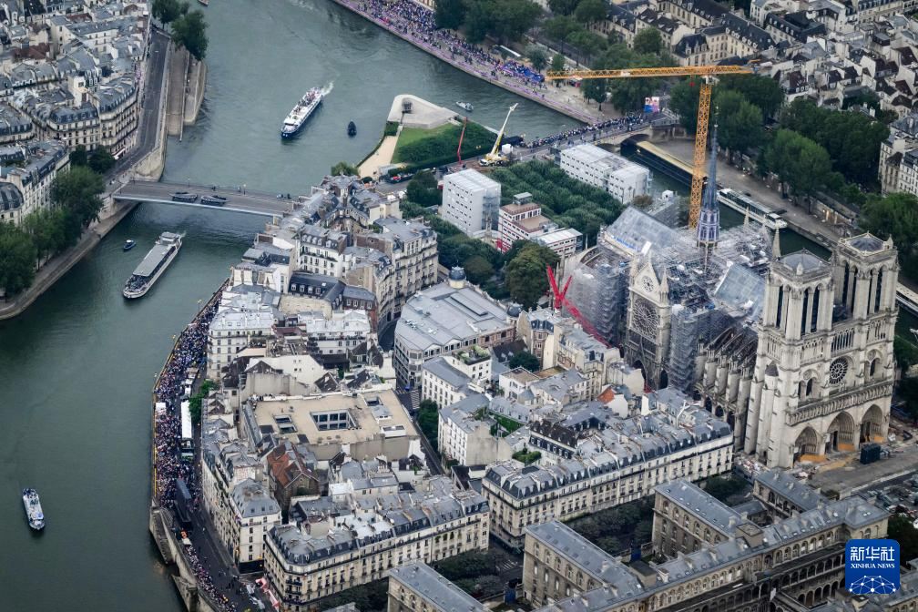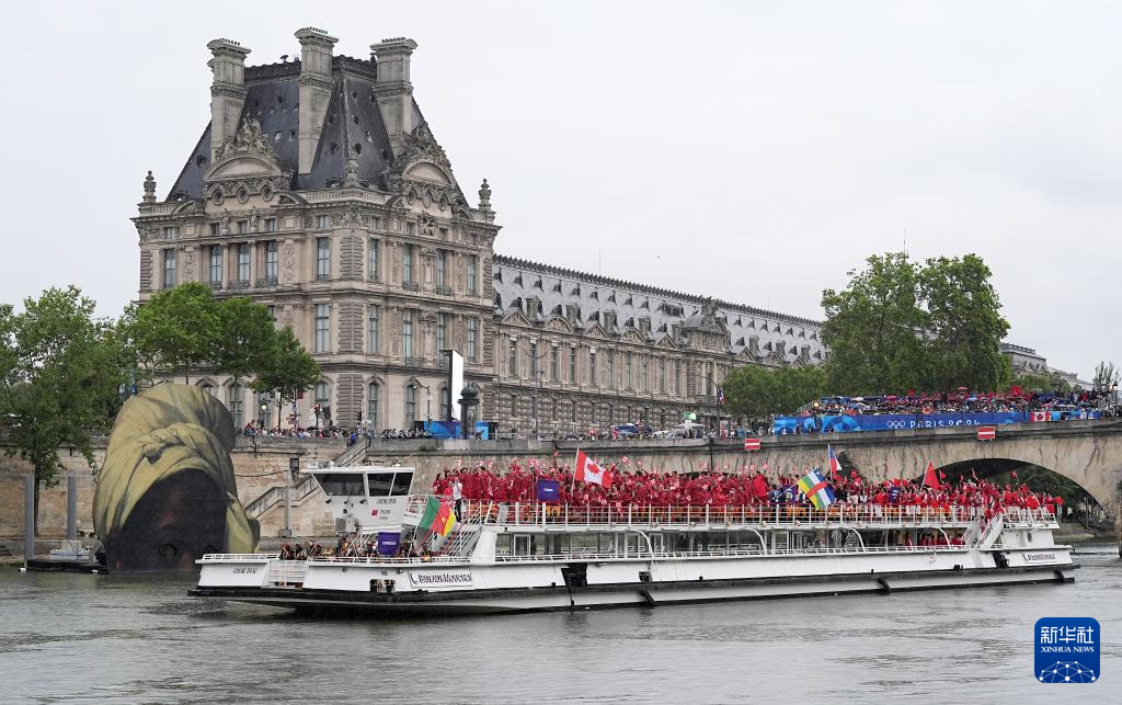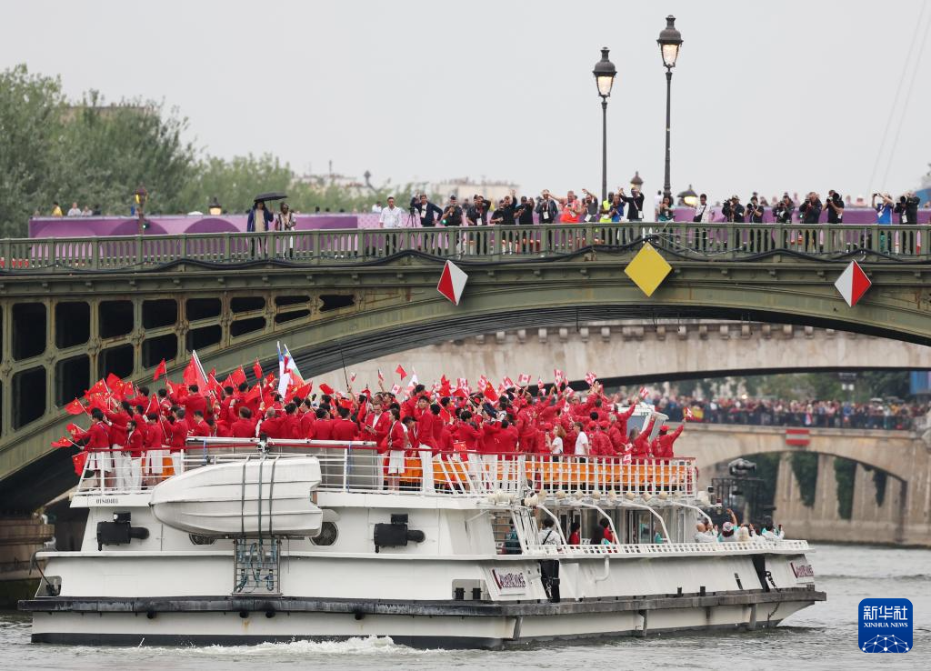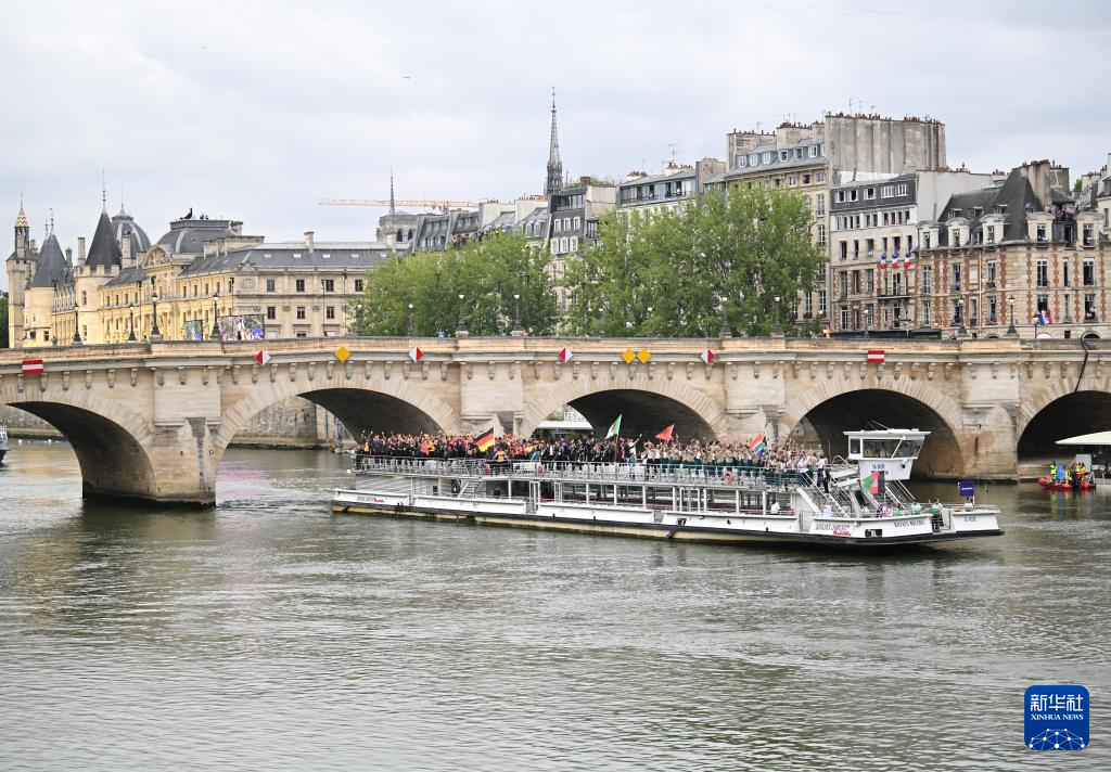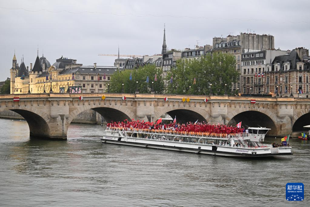 7月26日,各體育代表團在開幕式上,右側是巴黎圣母院。新華社發(fā)(POOL照片/丹·馬蘭)pagebreak