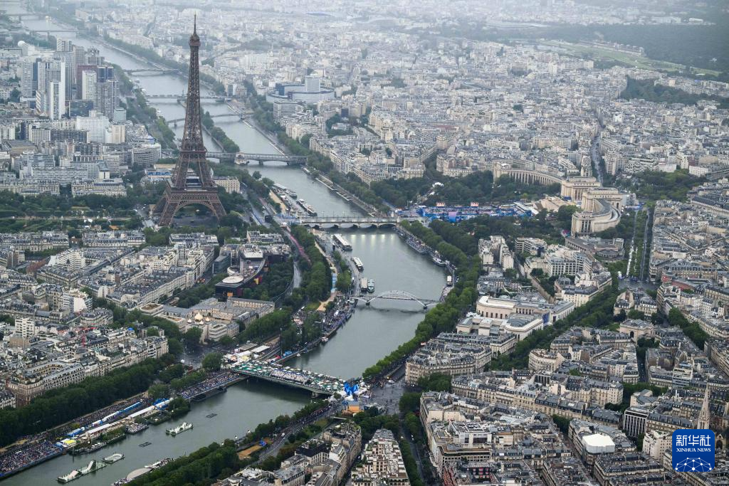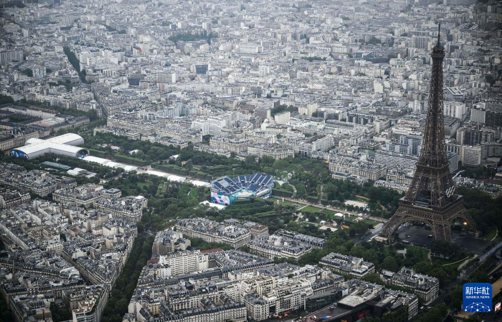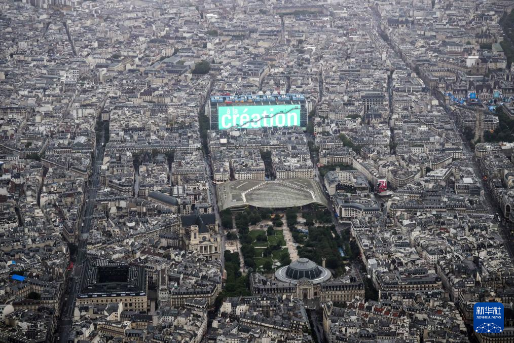 俯瞰開幕式上的埃菲爾鐵塔和戰(zhàn)神廣場(7月26日攝)。新華社發(fā)(POOL照片/利昂內爾·博納旺蒂爾)