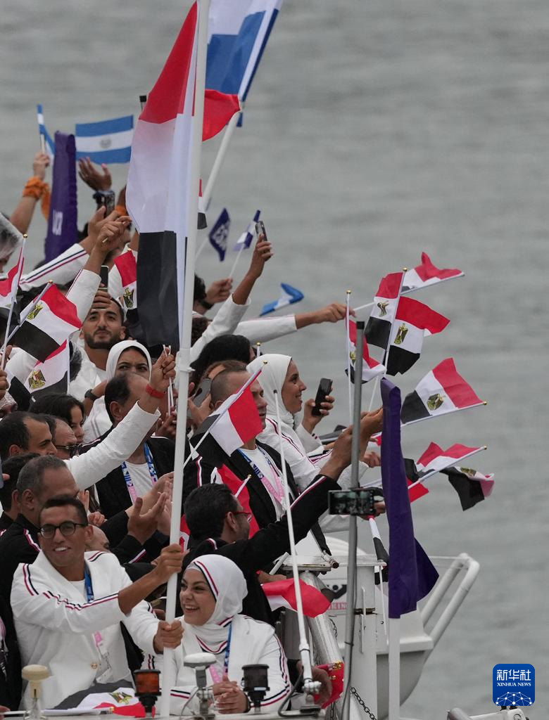 7月26日,埃及體育代表團(右)在開幕式上。新華社記者 萬象 攝