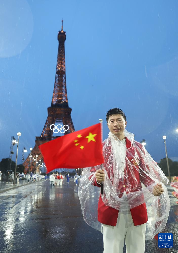 7月26日,中國體育代表團旗手、乒乓球選手馬龍在埃菲爾鐵塔前。新華社記者 李明 攝pagebreak