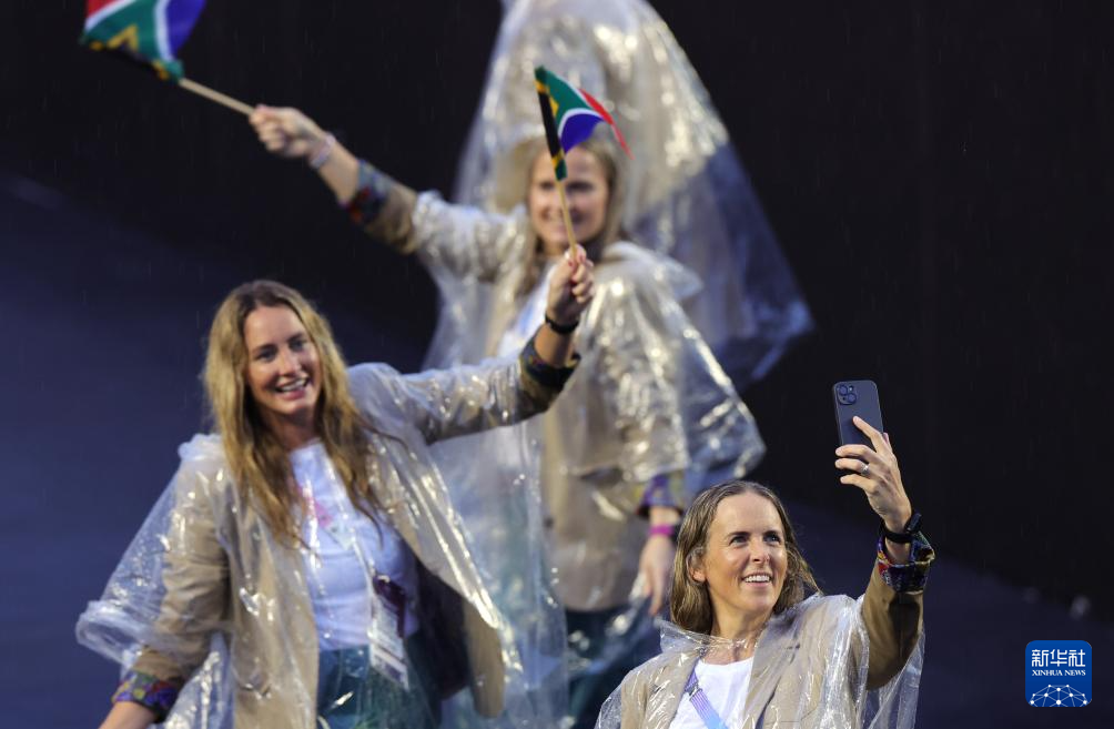 7月26日,南非體育代表團成員在開幕式上慶祝。新華社記者 李明 攝