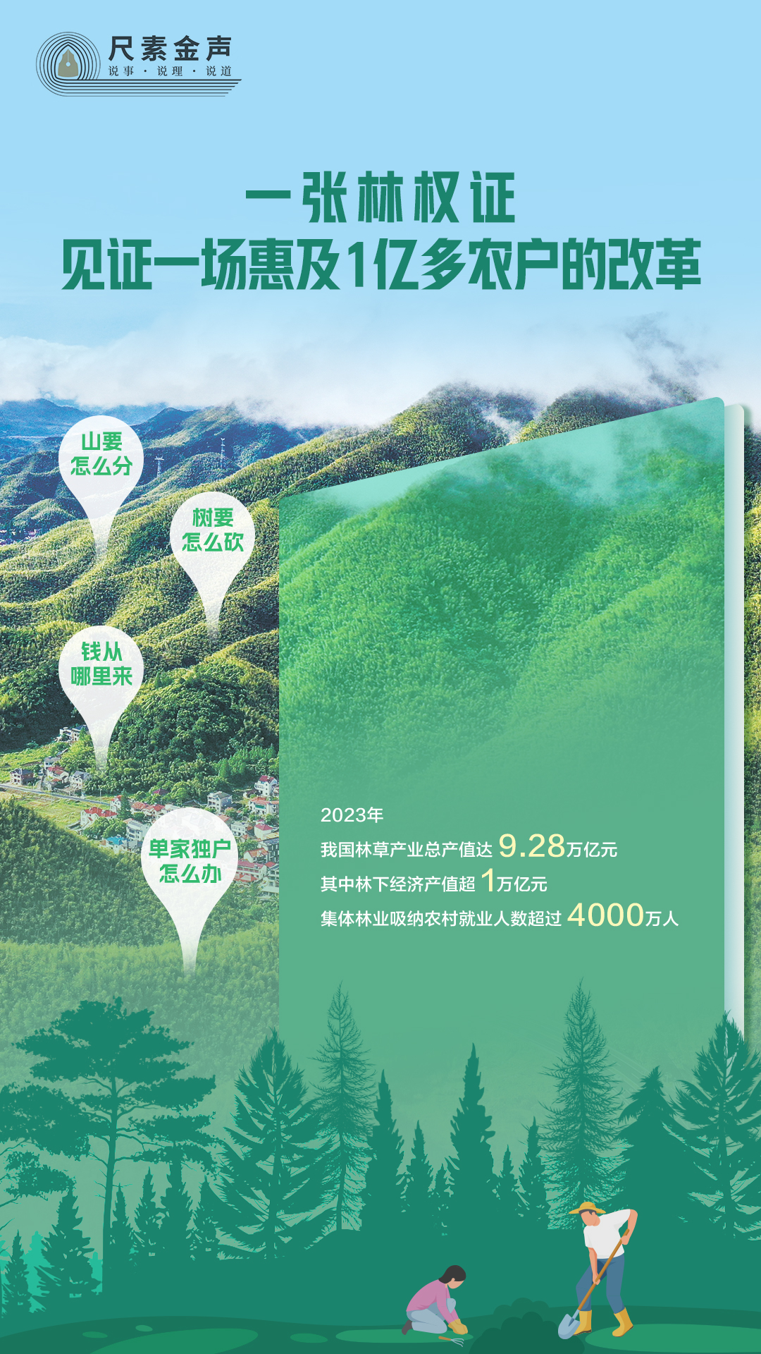 林改,改出了滿目青山,改出了金山銀山,廣大集體林區(qū)發(fā)展添活力,億萬林農(nóng)鼓腰包。去年,我國林草產(chǎn)業(yè)總產(chǎn)值達(dá)9.28萬億元,其中林下經(jīng)濟(jì)產(chǎn)值超1萬億元,經(jīng)濟(jì)林產(chǎn)量達(dá)2.26億噸,成為繼糧食、蔬菜之后的第三大農(nóng)產(chǎn)品,集體林業(yè)吸納農(nóng)村就業(yè)人數(shù)超過4000萬人。