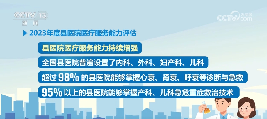 央視網(wǎng)消息:國家衛(wèi)生健康委29日通報(bào)了2023年度縣醫(yī)院醫(yī)療服務(wù)能力評估情況,全國共有2062家縣醫(yī)院參與醫(yī)療服務(wù)能力第三方評估,縣域覆蓋率達(dá)到98.6%。評估顯示,全國有91.85%的縣醫(yī)院符合基本標(biāo)準(zhǔn),也就是相當(dāng)于達(dá)到二級醫(yī)院能力,其中符合推薦標(biāo)準(zhǔn)達(dá)到三級醫(yī)院能力的占比超過一半。