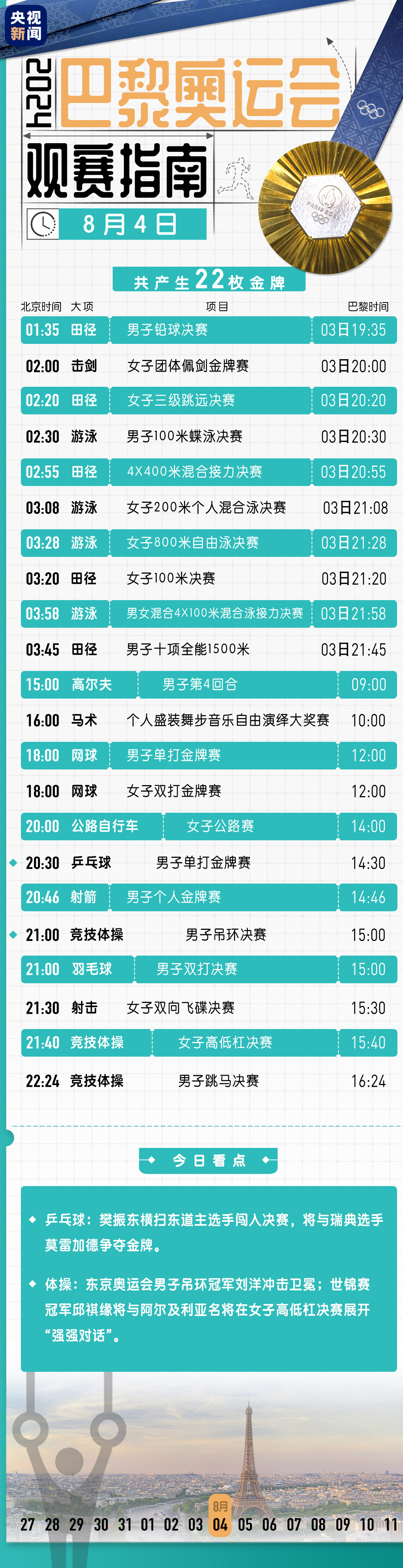 巴黎奧運(yùn)會(huì)第九個(gè)比賽日將產(chǎn)生20枚金牌。中國(guó)體育代表團(tuán)將在乒乓球、羽毛球等項(xiàng)目上沖擊金牌。