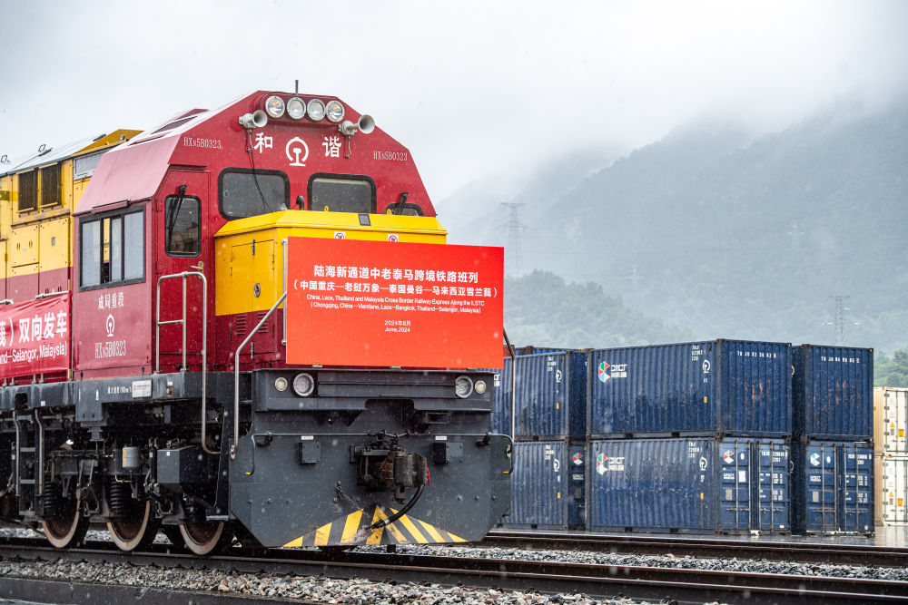 一列西部陸海新通道中老泰馬跨境鐵路班列駛出車站。新華社記者 唐奕 攝