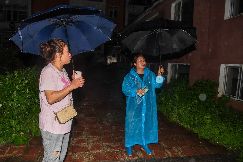 7月29日,在吉林省臨江市,建國(guó)街道臺(tái)興社區(qū)黨委書(shū)記孫愛(ài)武(右)和同事在怡景花園小區(qū)排查人員安置情況。新華社記者 張楠 攝