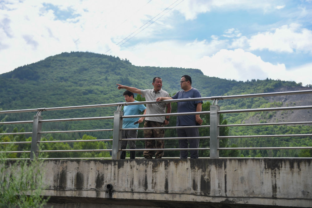 7月31日,在臨城村,金勇誠(chéng)(右二)帶領(lǐng)臨江市水利局的專家查看受損的供水管道。新華社記者 張楠 攝