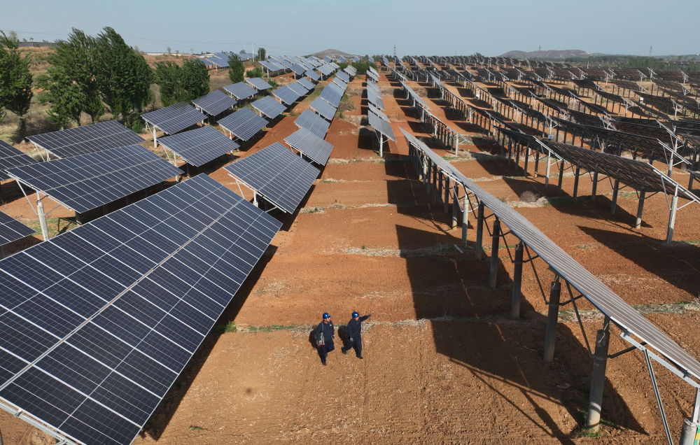 2024年4月16日,工人在河北省石家莊市靈壽縣譚莊鄉(xiāng)程家莊村的“農(nóng)光互補(bǔ)”光伏發(fā)電場(chǎng)巡查(無(wú)人機(jī)照片)。新華社記者 楊世堯 攝