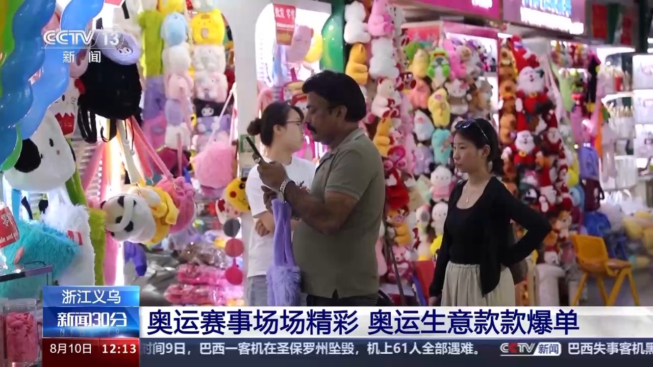 搭乘奧運東風的不僅是體育健兒的同款配飾,奧運周邊產品也備受市場青睞。在義烏國際商貿城,這里匯集26個大類、210多萬種商品,不僅滿足了全球觀眾和參賽者的需求,也給義烏商家?guī)砹嗣黠@的經(jīng)濟效益。