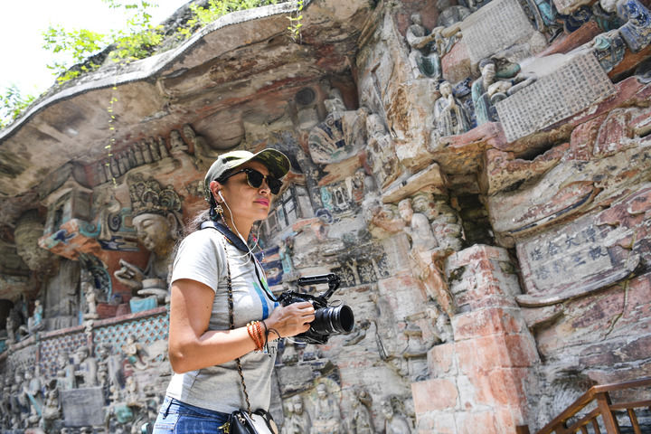 外籍游客在重慶大足石刻景區(qū)游覽(2024年7月19日攝)?! ⌒氯A社記者 王全超 攝