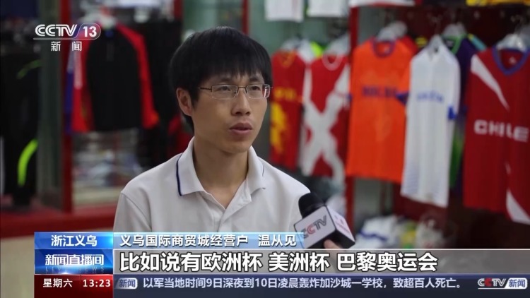 義烏國(guó)際商貿(mào)城經(jīng)營(yíng)戶 溫從見:今年因?yàn)槭鞘澜绱筚惸辏热缯f(shuō)有歐洲杯、美洲杯、巴黎奧運(yùn)會(huì),差不多3月份開始,我們就已經(jīng)著手開始接單、打樣、生產(chǎn)這一系列的運(yùn)動(dòng)服飾。我們總共3個(gè)賽事下來(lái)銷了30萬(wàn)件左右。
