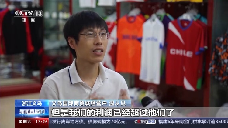 溫從見是義烏國(guó)際商貿(mào)城的一位經(jīng)營(yíng)戶,從事球衣服裝行業(yè)已經(jīng)17年,經(jīng)歷了多輪體育賽事的備貨、生產(chǎn)和銷售。得益于敏銳的反應(yīng)力和良好的適應(yīng)力,溫從見在今年大賽期間收益頗豐。