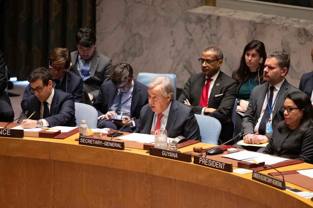 2月23日,在位于紐約的聯(lián)合國總部,聯(lián)合國秘書長古特雷斯(前排中)在烏克蘭問題高級別公開會上發(fā)言。烏克蘭危機升級兩周年之際,聯(lián)合國安理會23日舉行烏克蘭問題高級別公開會,與會多方呼吁通過政治手段解決烏克蘭危機。新華社記者謝鍔攝