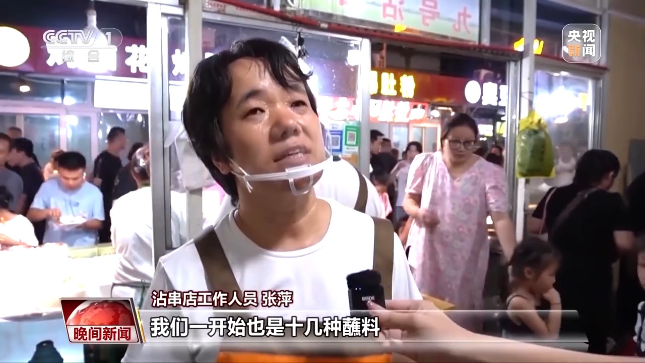 夜幕降臨、高溫消散,山西太原食品街就迎來大批食客。食品街的一家沾串店面積不大,食客只能站著吃,但卻吸引大批食客光顧。沾串食材是熟的,食客蘸上各個(gè)口味的醬料就能直接開吃。