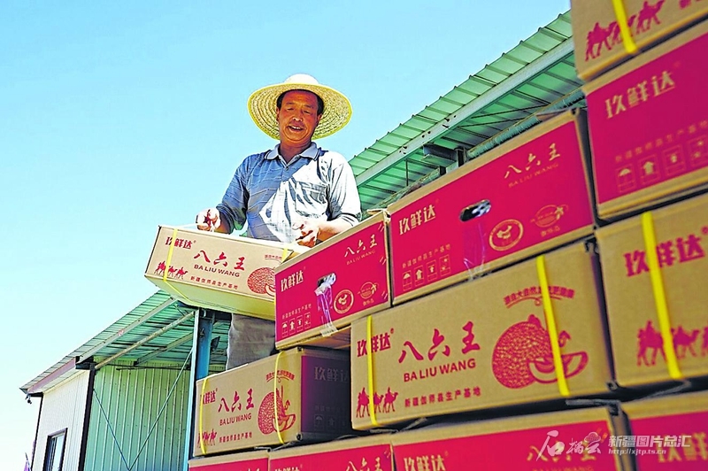 8月5日,位于伽師縣臥里托格拉克鎮(zhèn)的新疆果品(伽師)批發(fā)交易市場,工人在裝運(yùn)伽師瓜,準(zhǔn)備運(yùn)往疆外。便捷的交通,讓當(dāng)?shù)剞r(nóng)產(chǎn)品快速發(fā)往全國。 石榴云/新疆日報(bào)記者何新社攝