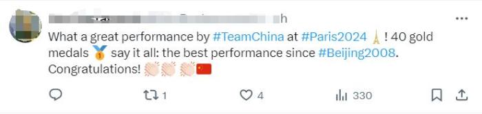 “中國(guó)隊(duì)在2024巴黎奧運(yùn)會(huì)上的表現(xiàn)太棒了!40枚金牌收官,這是自2008年北京奧運(yùn)會(huì)以來中國(guó)隊(duì)的最佳表現(xiàn)。恭喜!”