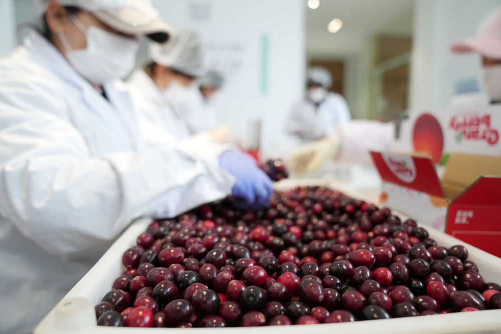 1月29日,在黑龍江省撫遠市蔓越梅種植基地,工作人員分揀蔓越莓鮮果。新華社記者 王建威 攝