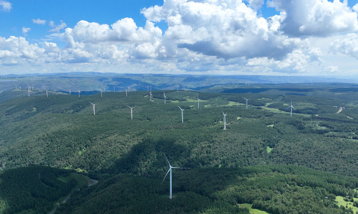 這是河北省圍場滿族蒙古族自治縣御道口鎮(zhèn)附近的風電場(2024年7月26日攝,無人機照片)。
