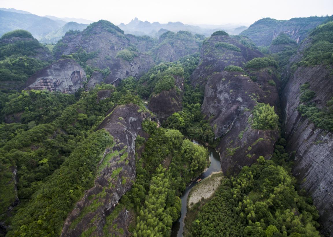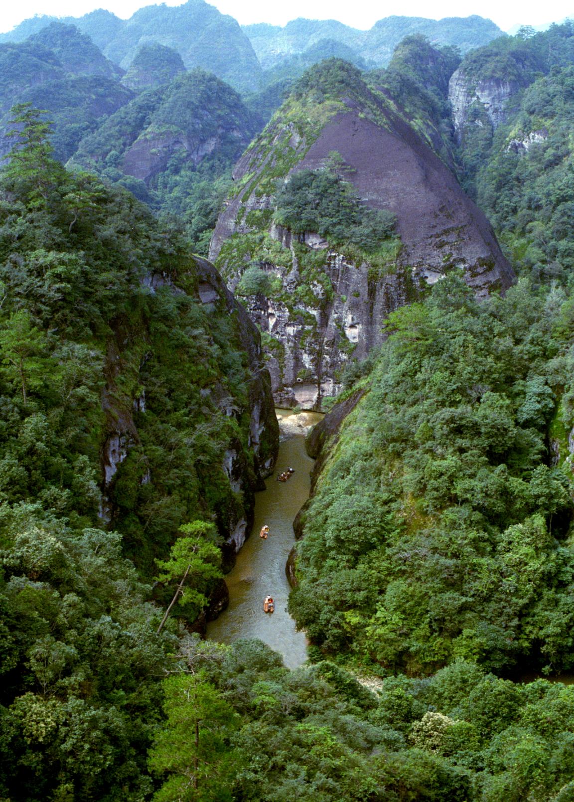 一下、一下、又一下!隨著排工在溪水里劃動竹竿,竹排動力十足地乘水漂流。隨即,排工在排上唱起韻味十足的山歌,歌聲悠揚,回響在溪水如碧的峽谷間。兩岸石壁峭立,因不同的風(fēng)化程度呈現(xiàn)各異奇觀,盡顯大自然的鬼斧神工。有著“九十九曲,八十八灘”美名的上清溪位于福建省三明市泰寧縣,宛若一條蛟龍,盤踞在深山幽谷中,纏繞于赤壁丹崖間。
