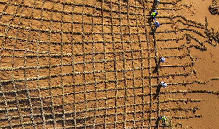 治沙工人在寧夏中衛(wèi)市境內(nèi)的騰格里沙漠鋪設(shè)刷狀網(wǎng)繩式草方格沙障(2024年5月30日攝,無(wú)人機(jī)照片)。