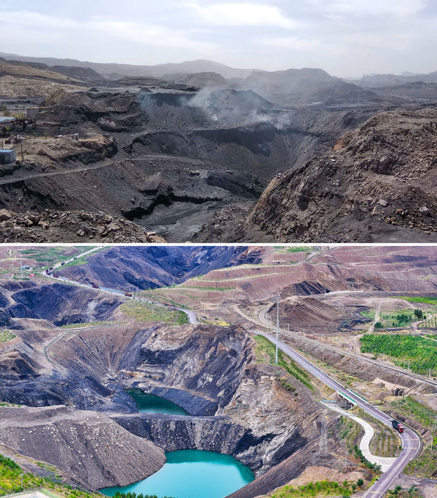 拼版照片,上圖為:位于寧夏石嘴山市的賀蘭山石炭井礦區(qū)(2017年5月30日攝,新華社發(fā));下圖為:2024年8月6日拍攝的修復(fù)治理后的賀蘭山石炭井礦區(qū)(無(wú)人機(jī)照片,新華社記者馮開(kāi)華攝)。