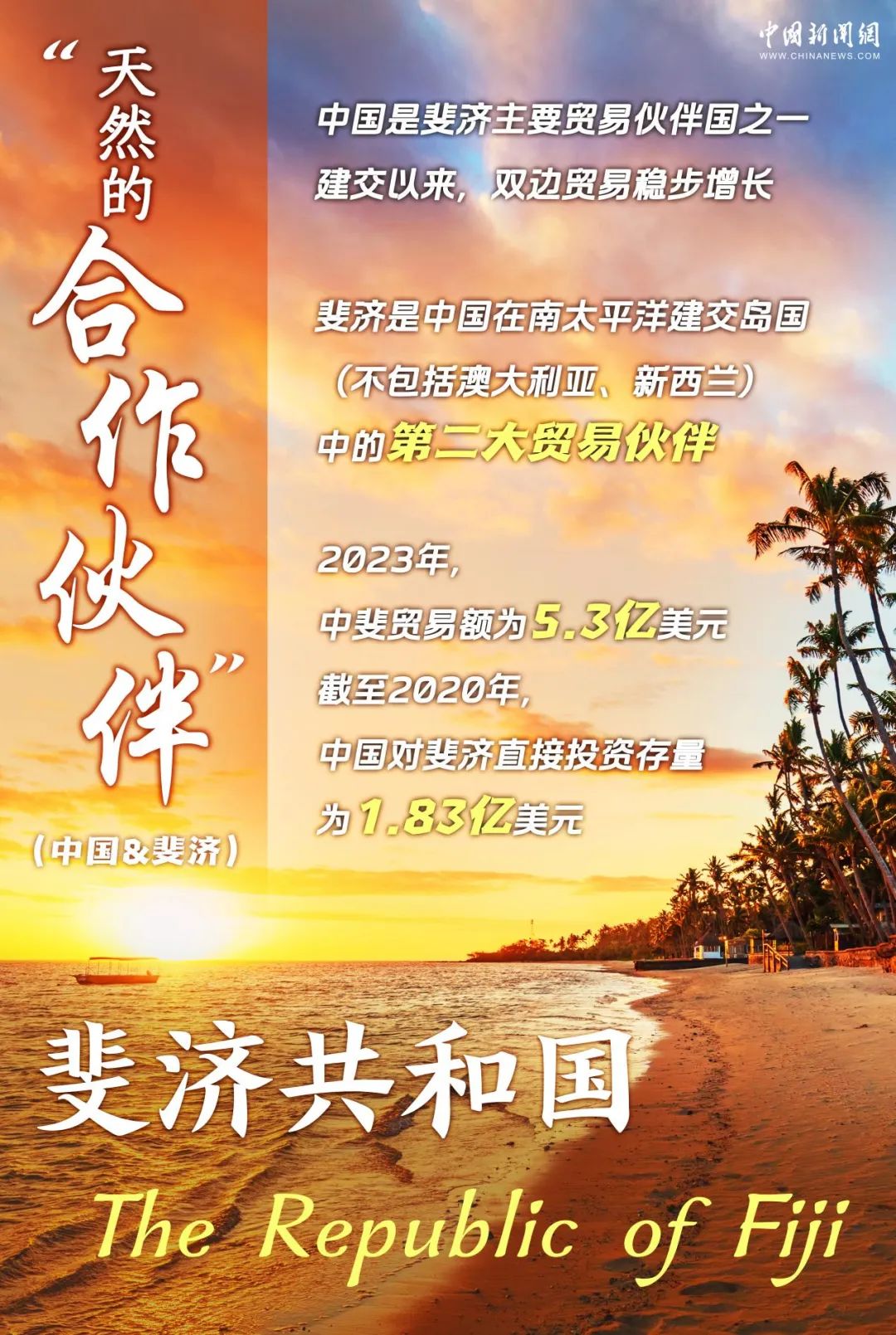 1975年11月5日,中國(guó)同斐濟(jì)建交。斐濟(jì)是太平洋島國(guó)中經(jīng)濟(jì)實(shí)力較強(qiáng)、經(jīng)濟(jì)發(fā)展較好的國(guó)家。建交以來,雙邊貿(mào)易穩(wěn)步增長(zhǎng)。2023年,中斐貿(mào)易額為5.3億美元。