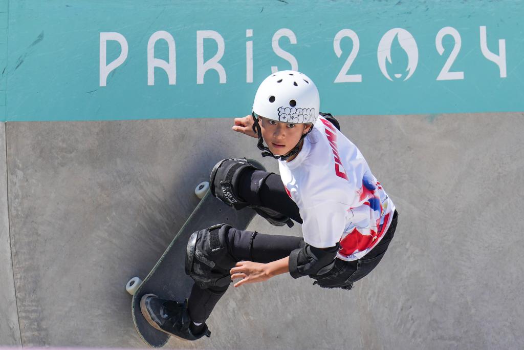 7月31日,鄧雅文在巴黎奧運會自由式小輪車女子公園賽決賽中。新華社記者 胡虎虎 攝