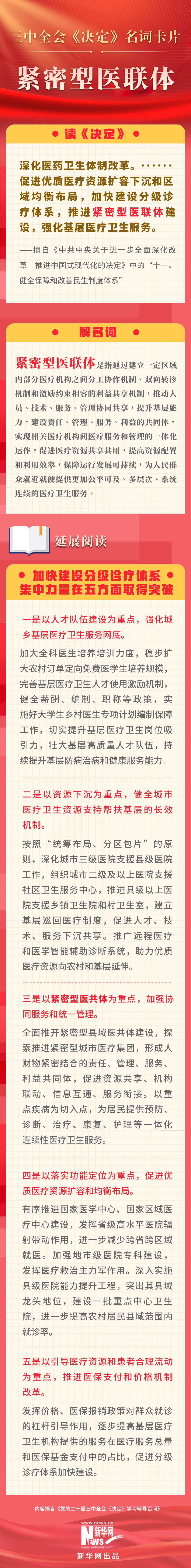 黨的二十屆三中全會審議通過了《中共中央關于進一步全面深化改革、推進中國式現(xiàn)代化的決定》。新華網依據《黨的二十屆三中全會〈決定〉學習輔導百問》,制作三中全會《決定》系列名詞卡片,和大家一起來深入學習領會二十屆三中全會精神。本期名詞是“緊密型醫(yī)聯(lián)體”。