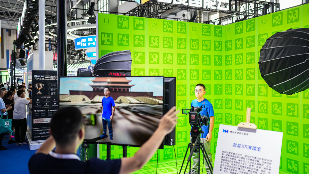 ↑8月28日,參觀者在數(shù)博會展館內(nèi)體驗(yàn)智能XR演播室。