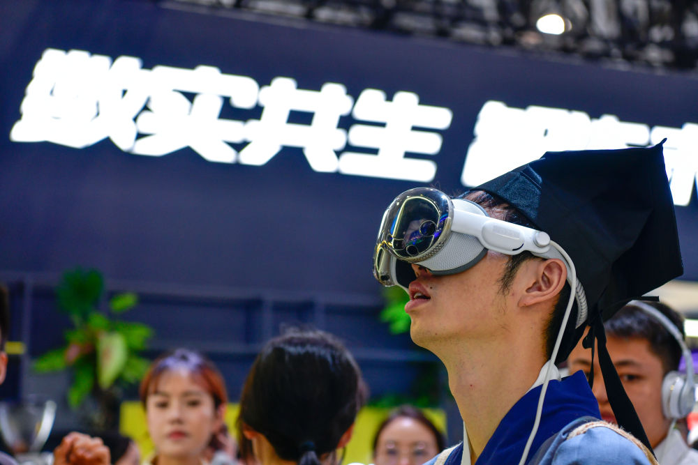 8月28日,參觀者在數(shù)博會上體驗(yàn)AVP空間觀賽。