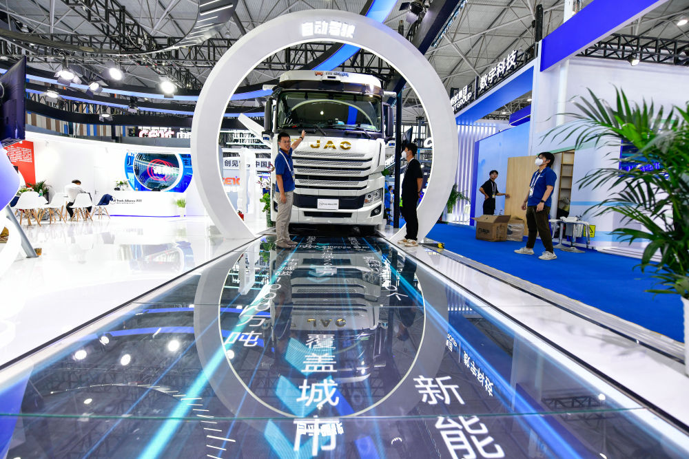 8月28日,工作人員在數(shù)博會上介紹無人駕駛重型卡車。