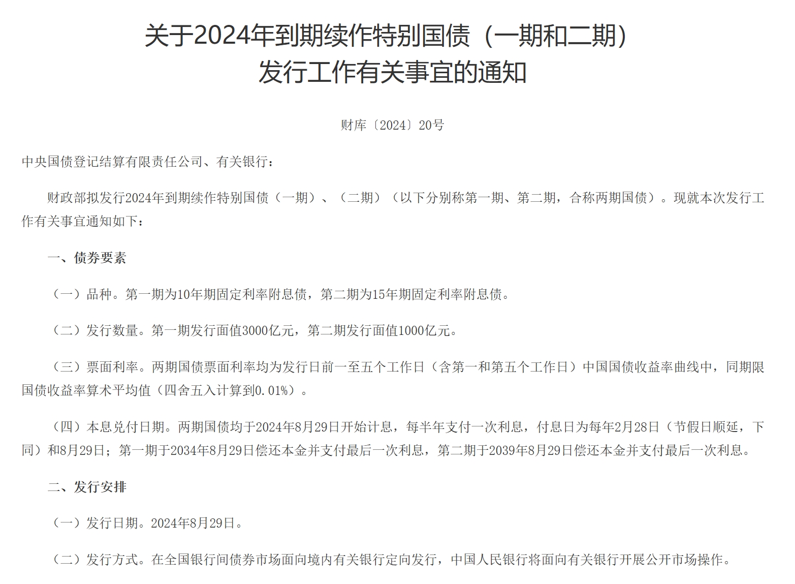 8月19日,財政部發(fā)布關(guān)于2024年到期續(xù)作特別國債發(fā)行工作有關(guān)事宜的通知。財政部擬發(fā)行2024年到期續(xù)作特別國債(一期)、(二期)。第一期為10年期固定利率附息債,第二期為15年期固定利率附息債。第一期發(fā)行面值3000億元,第二期發(fā)行面值1000億元。兩期國債票面利率均為發(fā)行日前一至五個工作日(含第一和第五個工作日)中國國債收益率曲線中,同期限國債收益率算術(shù)平均值(四舍五入計算到0.01%)。發(fā)行日期為2024年8月29日,在全國銀行間債券市場面向境內(nèi)有關(guān)銀行定向發(fā)行,中國人民銀行將面向有關(guān)銀行開展公開市場操作。