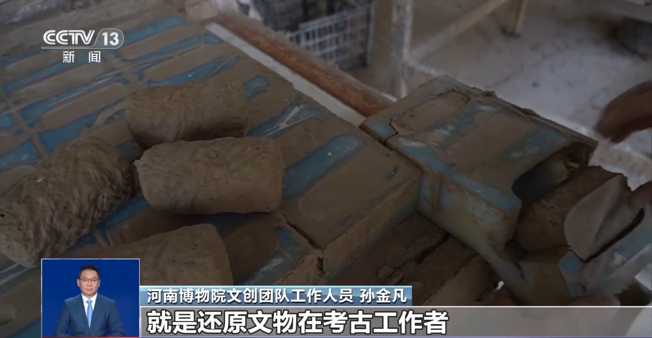 河南博物院文創(chuàng)團(tuán)隊工作人員 孫金凡:和泥巴、調(diào)配方、做試驗,每天都是灰頭土臉的,就是還原文物在考古工作者出土?xí)r的那一瞬間。同學(xué)就會問,還在村里面呢?我說對,還在那和泥巴。