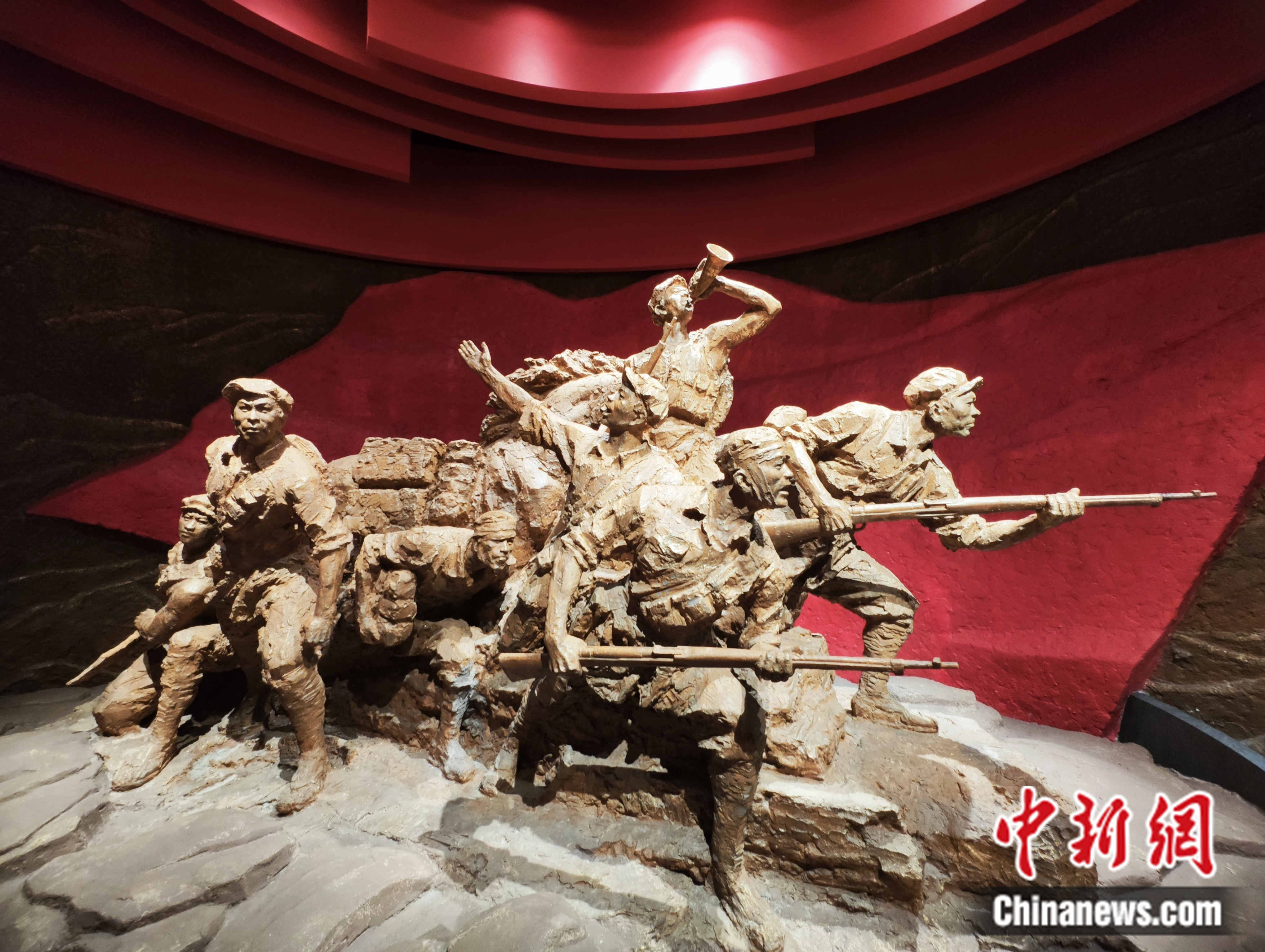展館正門外,“風(fēng)展紅旗如畫”的雕塑兩側(cè),十座紅軍司號(hào)員雕像映入眼簾,它們高數(shù)米,持小號(hào),形態(tài)各異,繪出一幅如火如荼的革命畫卷。