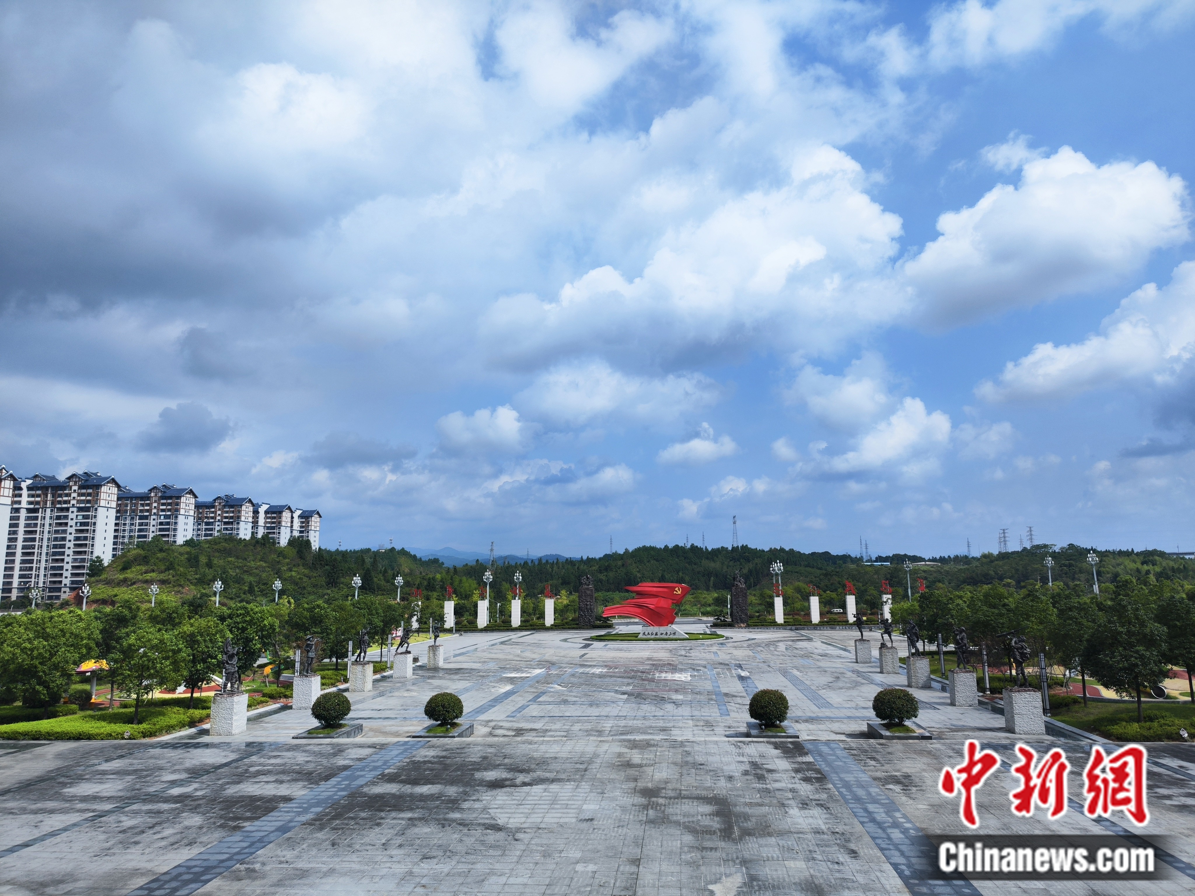 寧化縣長征精神教育基地外,高樓林立,綠樹成蔭。劉越 攝