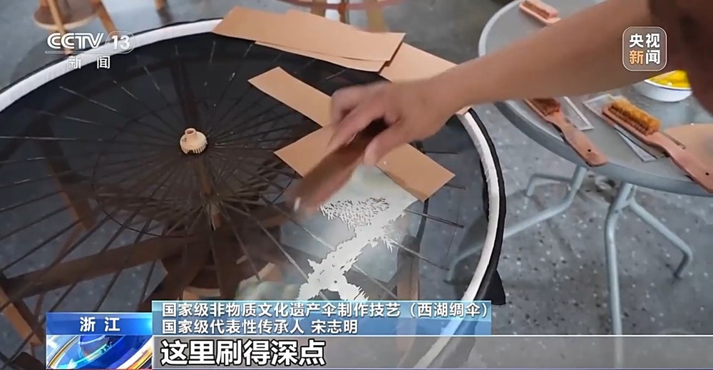 國家級非物質(zhì)文化遺產(chǎn)傘制作技藝(西湖綢傘)國家級代表性傳承人 宋志明:刷的過程當(dāng)中有講究,手勢的輕重,融合什么顏色,比方說這里是個亮點,這里刷得深點,這里讓顏料自然地飄過去,這里就不刷了,點到為止了。像這里有個月亮,它的光是從這里射下來的,所以我這里就讓顏料自然地飄過去,樹蔭這里要加強,這里要刷深。