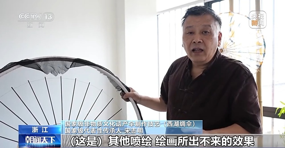 國家級非物質(zhì)文化遺產(chǎn)傘制作技藝(西湖綢傘)國家級代表性傳承人 宋志明:刷出來的圖案有靈動感,這是其他噴繪、繪畫所出不來的效果,特別是在絲綢傘面上來畫,通過顏料的霧狀,刷花呈現(xiàn)的效果是獨一無二的。