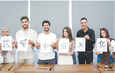 7月3日,埃及中國圖書中心揭牌儀式在埃及開羅巴德爾大學舉辦。圖為參加活動的埃及大學生展示書法。