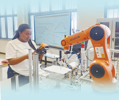 埃塞俄比亞魯班工坊由天津職業(yè)技術(shù)師范大學與埃塞聯(lián)邦職業(yè)技術(shù)培訓學院合作建立,于2021年4月揭牌啟運,聚焦人工智能領(lǐng)域,對接當?shù)睾献髟盒5碾姎庾詣踊c控制技術(shù)管理等專業(yè)。圖為當?shù)貙W生在操作工業(yè)機器人。